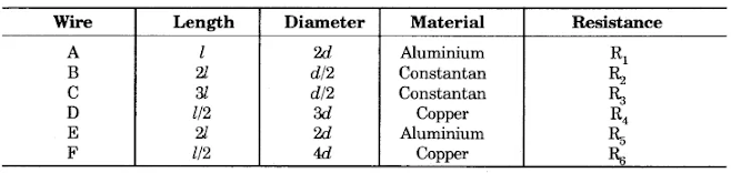 (ii) Six wires labelled as A, B, C, D, E, F have been designed as per the followig parameters: